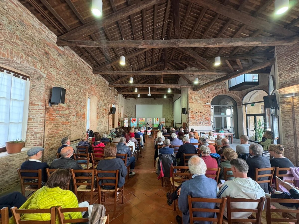 Il volume è frutto di un lavoro quadriennale che è stato possibile solo grazie al lavoro dei ragazzi dell’Istituto comprensivo storico della Resistenza di CuneoMercoledì 22 aprile a Palazzo Drago un folto pubblico ha partecipato alla presentazione del libro “Mio nonno era partigiano” (Fusta Editore, copertina di Sandro Midulla), organizzata dall’Anpi di Verzuolo (moderatori il presidente della sezione Dario Peirano e la referente del progetto Anna Bonetto) in collaborazione con l’Istituto Storico della Resistenza di Cuneo (rappresentato dallo storico Marco Ruzzi) e con il patrocinio del Comune di Verzuolo, nell’ambito delle manifestazioni per il 25 Aprile nell’81° anniversario della Liberazione. L’inquadramento storico è opera del professore Livio Berardo, che ha approfondito i temi del ruolo del paese nella Resistenza cuneese e degli scioperi alla cartiera Burgo.