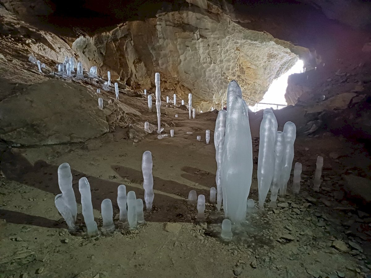 Lo spettacolo delle stalagmiti di ghiaccio nella grotta del Rio Martino a Crissolo