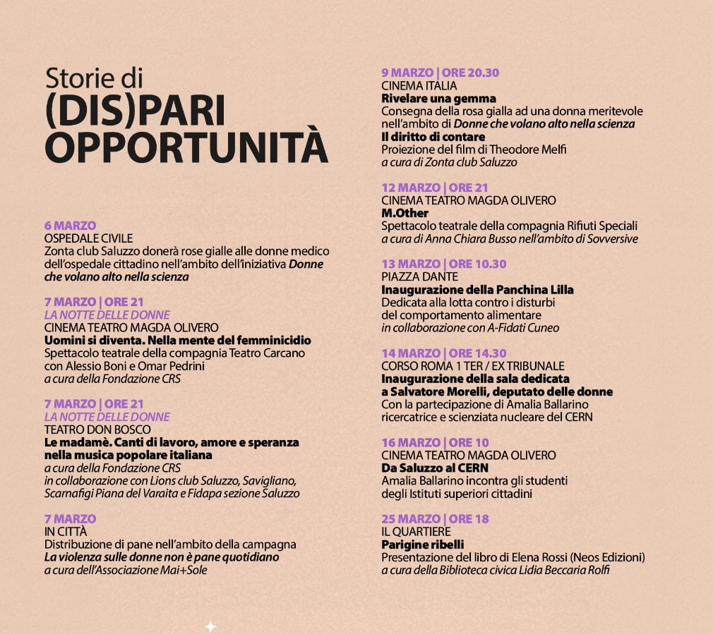 Un mese di appuntamenti organizzati in occasione dell’8 marzo nel segno della consapevolezza, della cultura e dell’impegno civileAnche nel 2026 la Città di Saluzzo celebra l’8 marzo, Giornata internazionale della donna, con il calendario “Storie di (dis)pari opportunità”, il progetto promosso dal Comune e dalla Consulta Pari Opportunità, in collaborazione con numerose realtà del territorio, per riflettere sui diritti, sul contrasto alla violenza di genere e sulla valorizzazione del talento femminile.