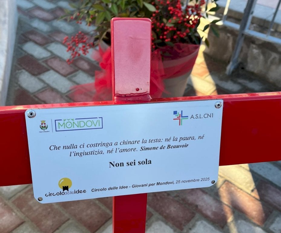 Nel pomeriggio anche a Mondovì si è tenuta la cerimonia presso la panchina rossa con la partecipazione del Comune di Mondovì con il sindaco Luca Robaldo, l’Arma dei Carabinieri, la Croce Rossa, il direttore generale Giuseppe Guerra, il direttore di presidio Alessandro Rapa con il dottor Maurizio Ippoliti e i rappresentanti delle associazioni presenti sul territorio Giuliana Turco per l’Orecchio di Venere e Giancarla Giondo per il Centro antiviolenza futuro. Sono stati posizionati il qrcode e la frase scelta dal Circolo delle Idee Giovani per Mondovì “Che nulla ci costringa a chinare la testa: né la paura, né l’ingiustizia, né l’amore” di Simone de Beauvoir.