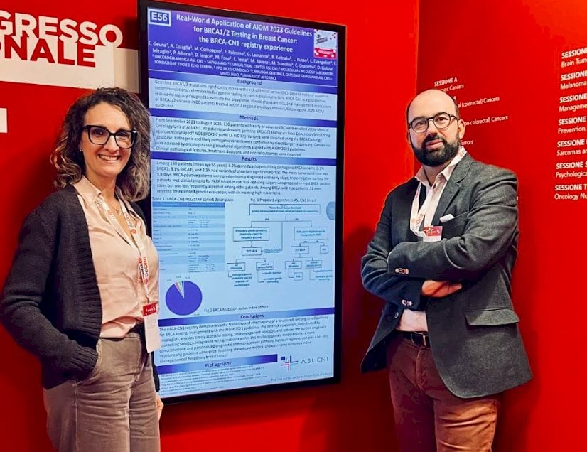 L'evento si è tenuto a Roma dal 7 al 9 novembre, presenti i dottori dell'ospedale saviglianese Elena Geuna e Danilo GaliziaL’Unità di Oncologia dell’ospedale SS. Annunziata ha partecipato attivamente al Congresso 2025 dell’Associazione Italiana di Oncologia Medica (AIOM) tenutosi a Roma dal 7 al 9 novembre. In questa occasione, gli oncologi Elena Geuna (autrice principale) e Danilo Galizia hanno presentato un poster scientifico relativo all’esperienza maturata nell’applicazione delle linee guida AIOM per il test genetico BRCA1/2 nel tumore della mammella. Questo studio rappresenta un contributo concreto per migliorare la qualità dell'assistenza e l'accesso a strategie terapeutiche mirate e personalizzate.